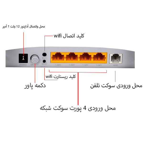 اگر به قسمت پشت این محصول نگاه کنید، یک آنتن از سمت راست میبینید که در کنار آن یک پورت خاکستریرنگ قرار دارد. این پورت خاکستری RJ-11 نام دارد و برای اتصال کابل تلفن استفاده میشود. در کنار پورت RJ-11 میتوانید، 4 پورت زرد رنگ شبکه (LAN) را بیابید که برای اتصال بهصورت باسیم و از طریق کابل شبکه به کار میروند. از 4 پورت شبکه که بگذرید، با کمی فاصله میتوانید یک کلید کوچک مشکیرنگ را ببینید که در زیر آن عبارت Wi-Fi حک شده است و همانطورکه از نامش پیداست، برای قطع و وصل کردن شبکهی بیسیم (Wi-Fi) به کار میرود. بعد از کلید Wi-Fi یک شیار بسیار ریز قرار دارد که در زیر آن عبارت Reset حک شده است و شما میتوانید با نگهداشتن آن به مدت چند ثانیه، تنظیمات دستگاه را ریست کرده و به حالت اولیه بازگردانید. در کنار شیار ریست، یک کلید مشکیرنگ دیگر درست مانند Wi-Fi قرار دارد که در زیر آن عبارت WPS نوشته شده است. دربارهی WPS در قسمت پایین توضیح خواهیم داد.