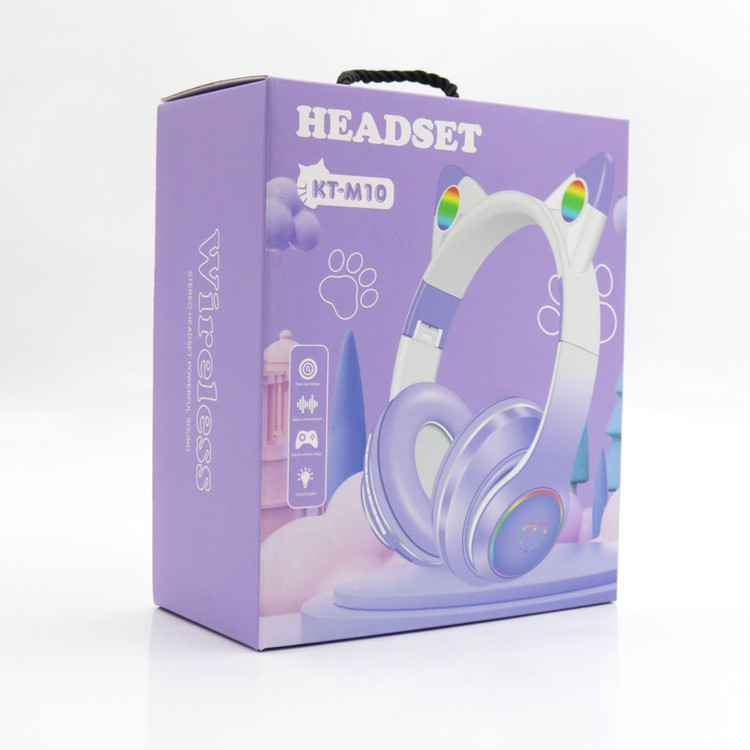 این هدفون زیبا دارای دو گوش بر روی دسته ها و با چراغ های ال ای دی رنگی می باشد. همچنین چراغ های طرح قلب نیز روشن می شوند که بسیار زیبا هستند. سایز دسته ها قابل تنظیم می باشند و گوشی ها جهت حمل آسان تر قابلیت تا شدن دارند. کلیدهای کنترلی بر روی گوشی سمت راست تعبیه شده که به شما امکان مدیریت کردن موزیک، خاموش و روشن و مکالمه را می دهد. مزیت های قابل توجه هدفون مدل KT-M10 ورودی AUX جک 3.5 میلیمتری، ورودی کارت حافظه (مموری کارت) و خاموش شدن خودکار در صورت عدم استفاده، اتصال از طریق بلوتوث و طراحی ارگونومیک و بسیار شکیل می باشد. مدل های کپی و تقلبی مدل KT-M10 در بازار بسیار فراوان است.