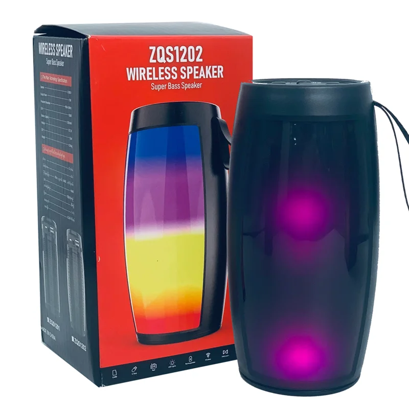 اسپیکر بلوتوثی رم و فلش خور ZQS 1202 یک اسپیکر با باند 2 اینچی و توان خروجی 5 وات است. نسبت سیگنال به نویز 50 دسی بل و فرکانس پاسخ آن در بازه 45 هرتز الی 18 کیلو هرتز است. پشتیبانی از اتصالات بی سیم نظیر بلوتوث تا برد 10 متر، پشتیبانی از کارت حافظه، فلش USB و پشتیبانی از رادیو FM از امکانات این اسپیکر می باشد. همچنین دارای کلید خاموش و روشن اسپیکر، کلید های مدیریت صدا، پخش موسیقی و تغییر حالات نورپردازی اسپیکر می باشد.