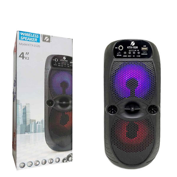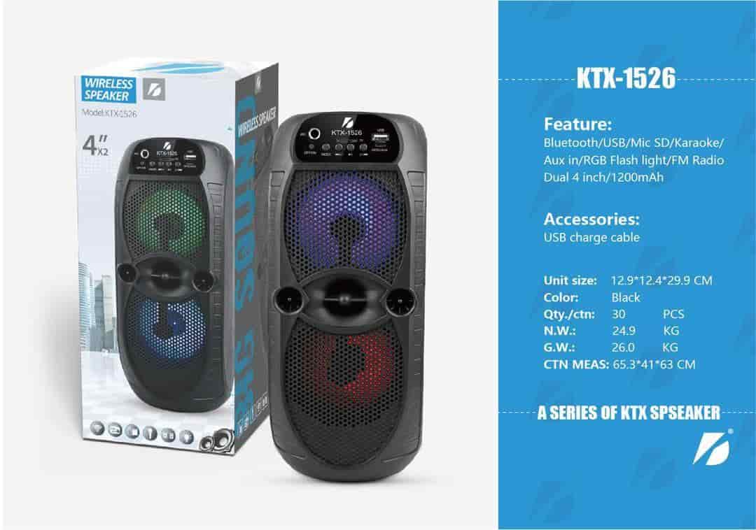 اسپیکرهای برند کی تی ایکس دارای مدلهای بیسیم با سیستم ارتباطی بلوتوث است که قابلیت حمل و نقل را ارائه میدهد. اسپیکر بیسیم کی تی ایکس مدل 1526 با بهرهگیری از رابط بلوتوث، امواج صوتی را دریافت کرده و از طریق دو درایور به پخش آنها میپردازد. کیفیت ساخت بدنه که از پلاستیک خشک تشکیل شده، با توجه به محدوده قیمت در سطح رضایت بخشی قرار دارد.