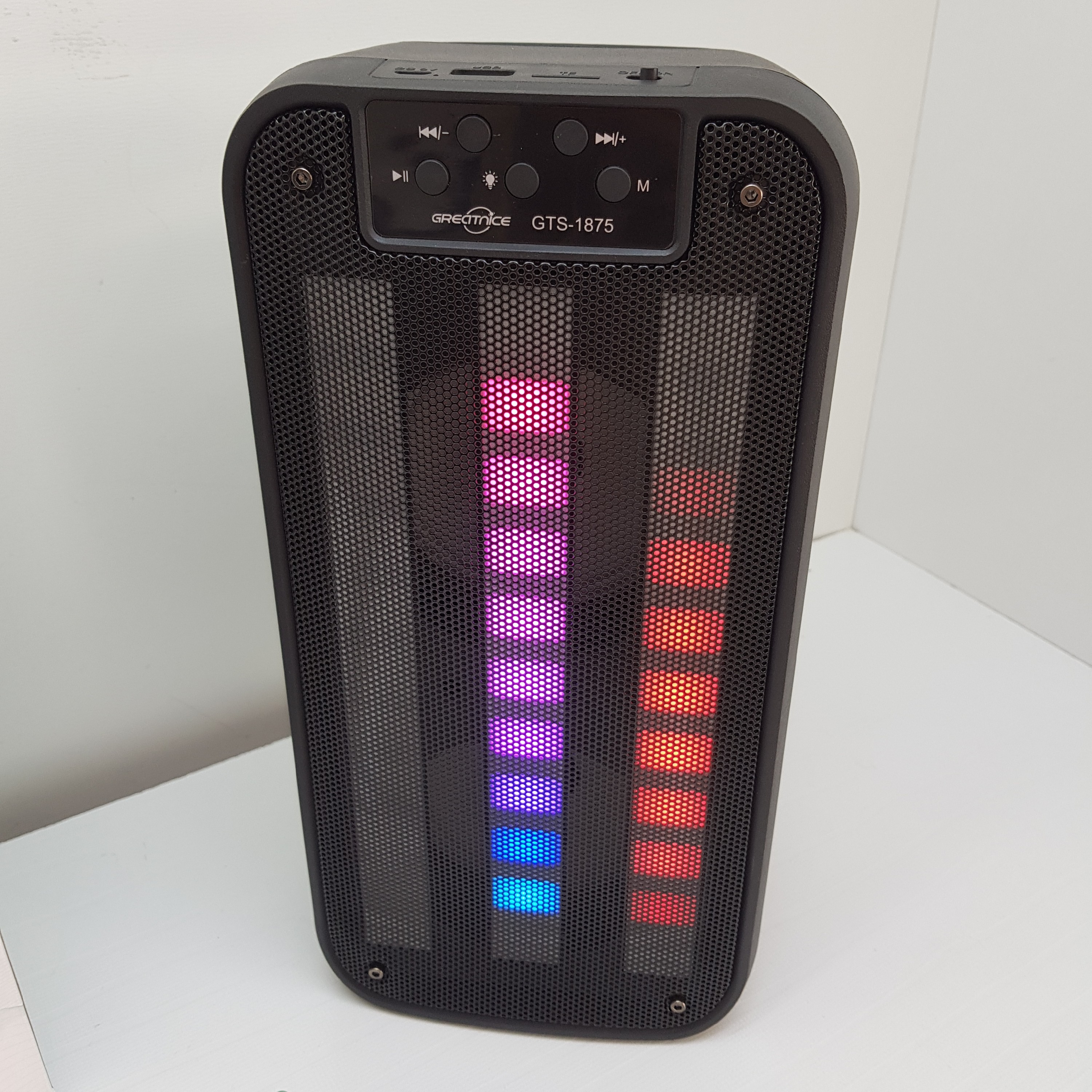با ارتفاع 31 سانتیمتر و طراحی مدرن و قابل حمل، این اسپیکر به راحتی در هر مکانی جای میگیرد و شما را در هر شرایطی همراهی میکند. اسپیکر وایرلس بلوتوث مدل GTS-1875 با قابلیتهای پیشرفته و عملکردی قدرتمند، گزینهای ایدهآل برای تمامی عاشقان موسیقی است که به دنبال صدایی با کیفیت بالا و جلوههای نوری هستند.