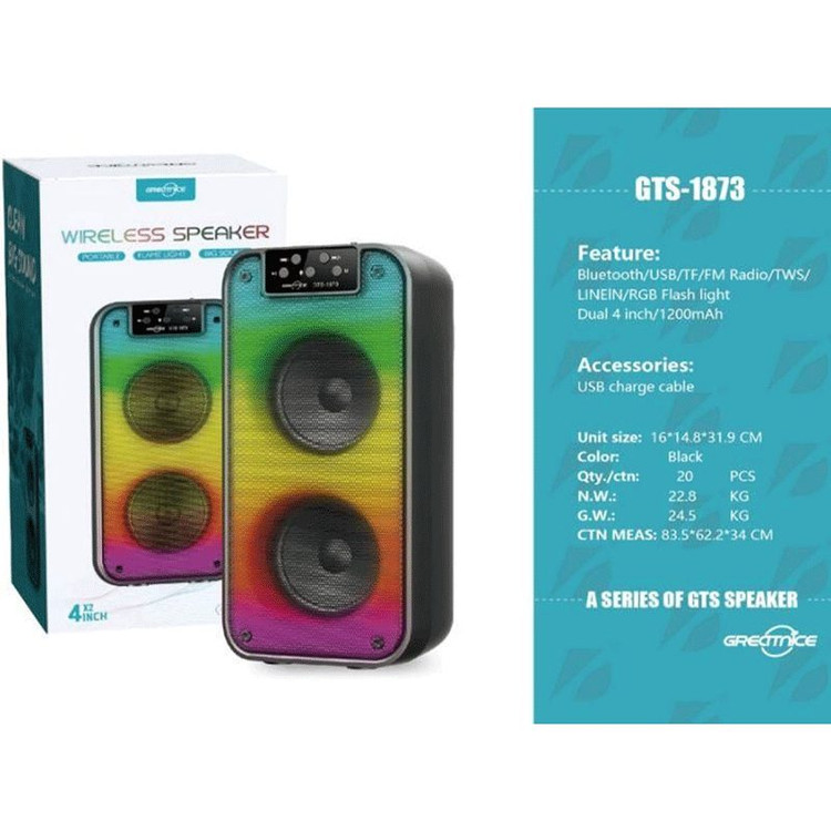 اسپیکر GTS-1873 یک مدل بلوتوثی و قابل حمل است که با دو باند 4 اینچی طراحی شده و به خاطر صدای قدرتمند و کیفیت بالا شناخته میشود. این اسپیکر برای استفاده در مهمانیها و محیطهای باز بسیار مناسب است. دو باند 4 اینچ: این اسپیکر دارای دو باند با اندازه 4 اینچ است که صدای واضح و باس قوی را فراهم میکنند. این باندها قدرت خروجی مناسبی برای پخش موسیقی با کیفیت بالا ارائه میدهند. نورپردازی جذاب: یکی از ویژگیهای متمایز این اسپیکر، نورپردازی LED جذاب آن است که با پخش موسیقی تغییر میکند و تجربهای بصری و هیجانانگیز برای کاربران به همراه دارد. این نورها در رنگها و افکتهای مختلف طراحی شدهاند که به محیط جلوه خاصی میبخشند. پخش بلوتوث: امکان اتصال به دستگاههای مختلف مانند گوشی موبایل، تبلت و لپتاپ از طریق بلوتوث فراهم است، که باعث راحتی در استفاده میشود. پورت USB و کارت حافظه: اسپیکر GTS-1873 از پورت USB و شیار کارت حافظه پشتیبانی میکند، که به کاربران اجازه میدهد موسیقیهای ذخیرهشده روی این دستگاهها را پخش کنند. رادیو FM: این مدل همچنین دارای قابلیت رادیو FM است که میتوان ایستگاههای رادیویی محلی را دریافت و پخش کرد.